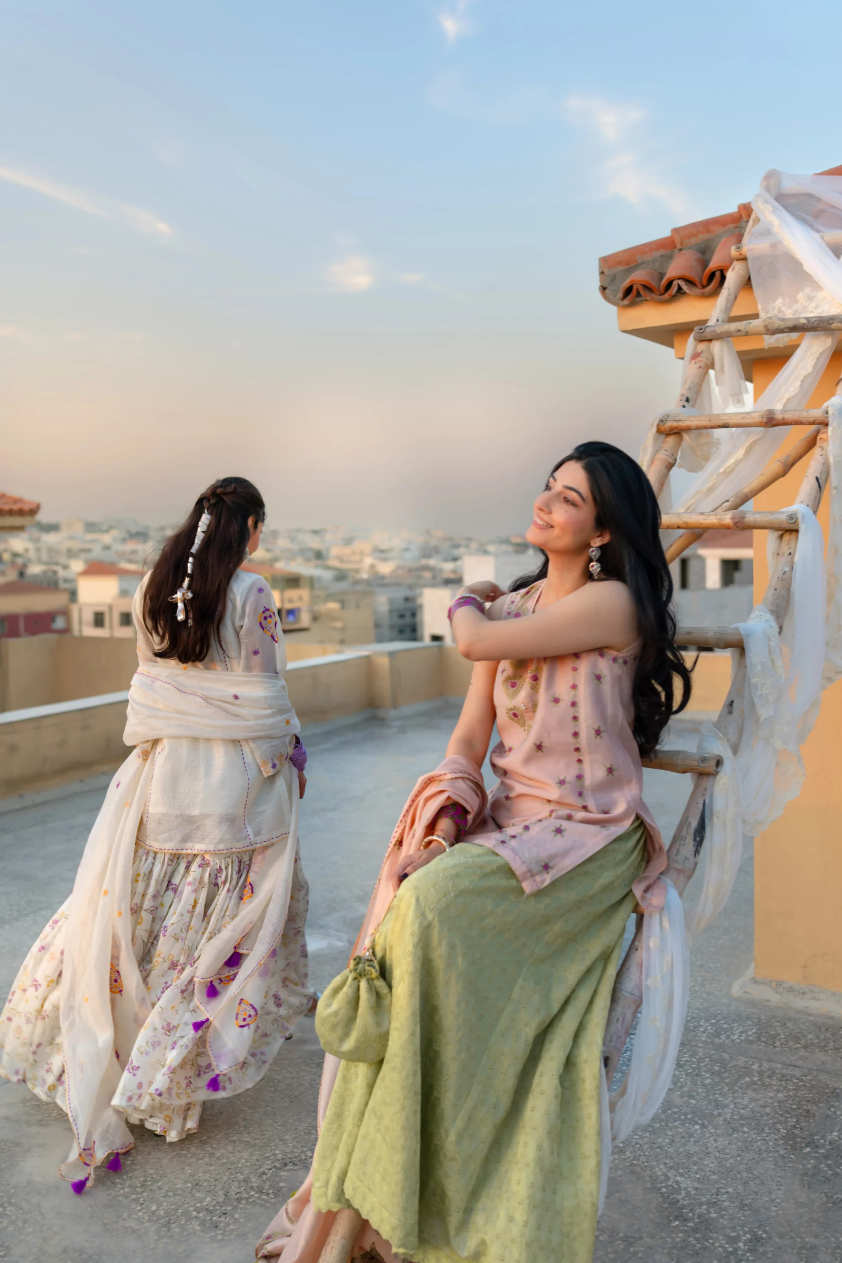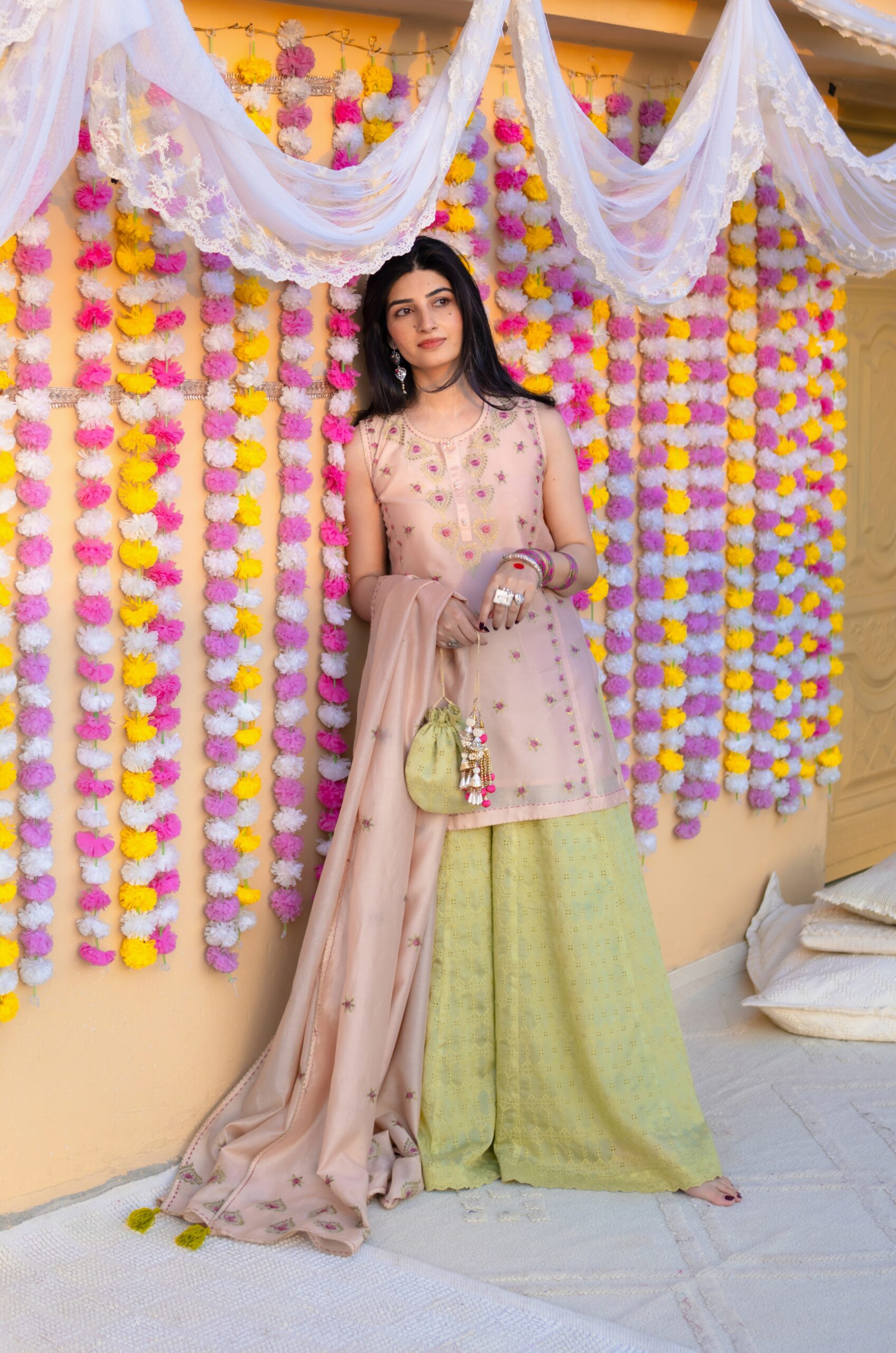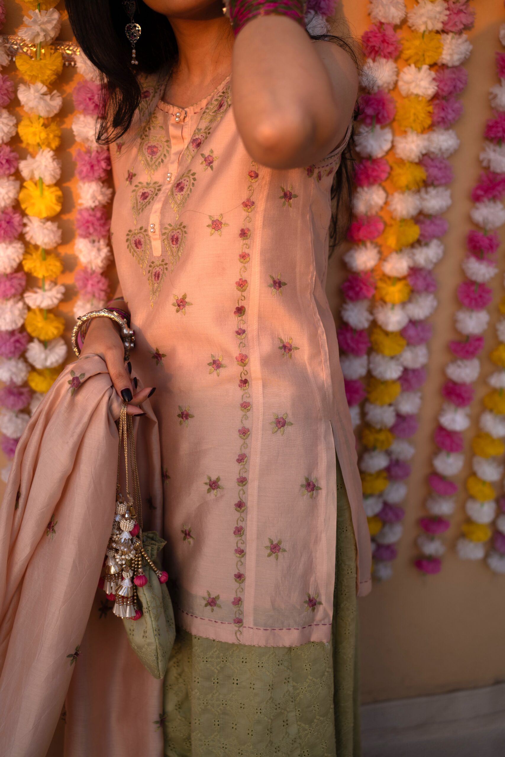 - A hand embroidered kurta and dupatta in premium silk lawn, paired with chikankari sharrara.