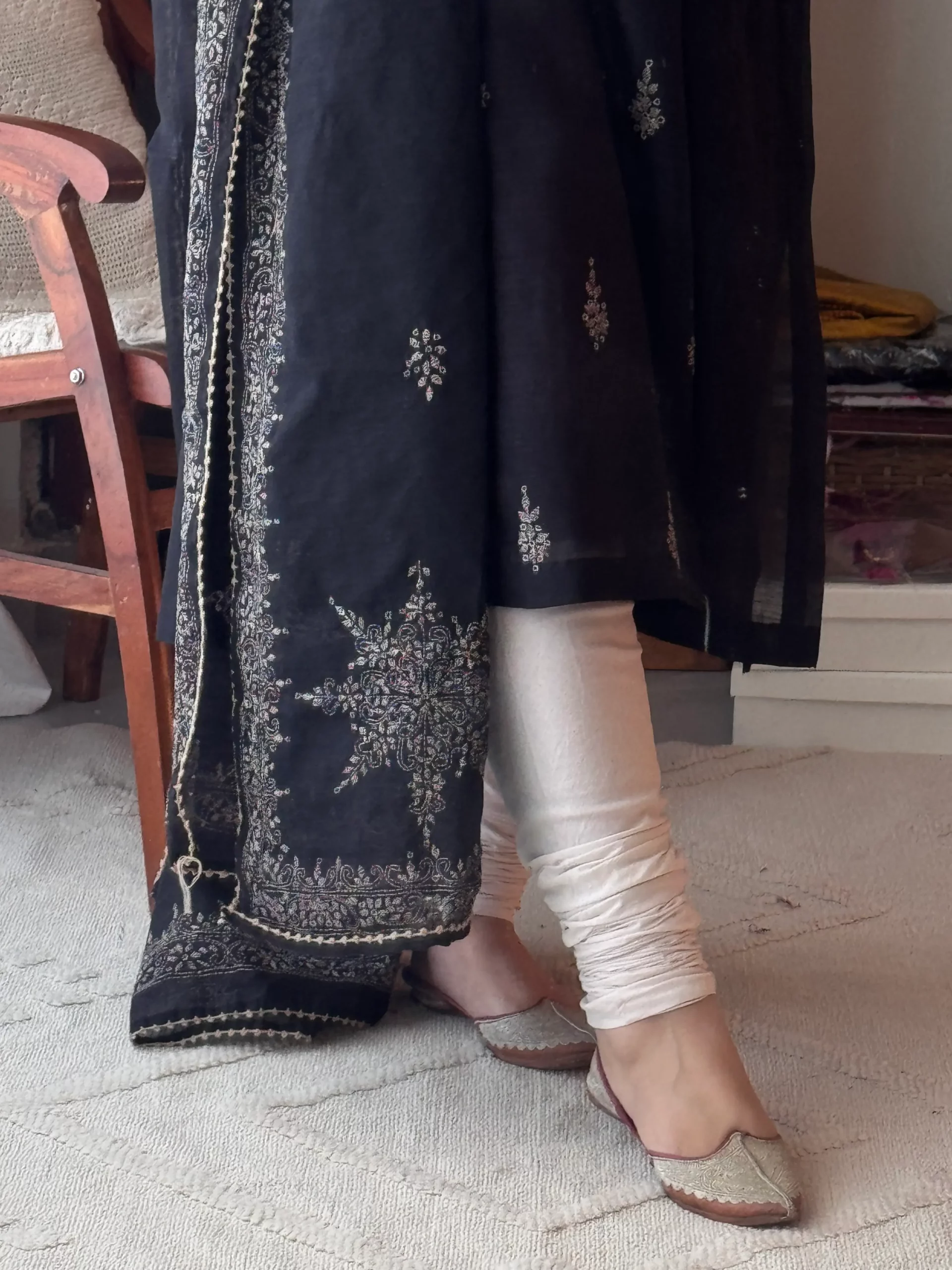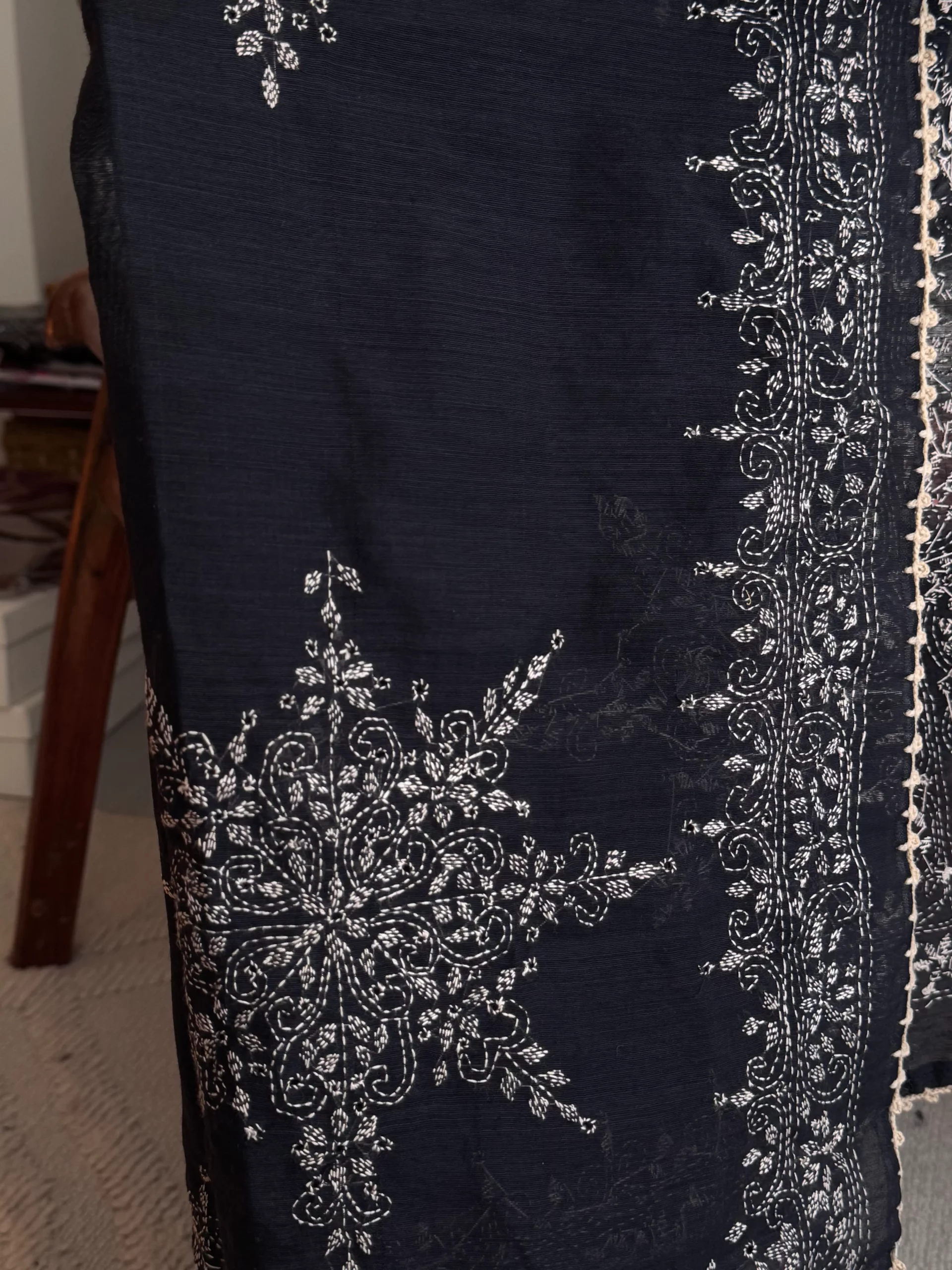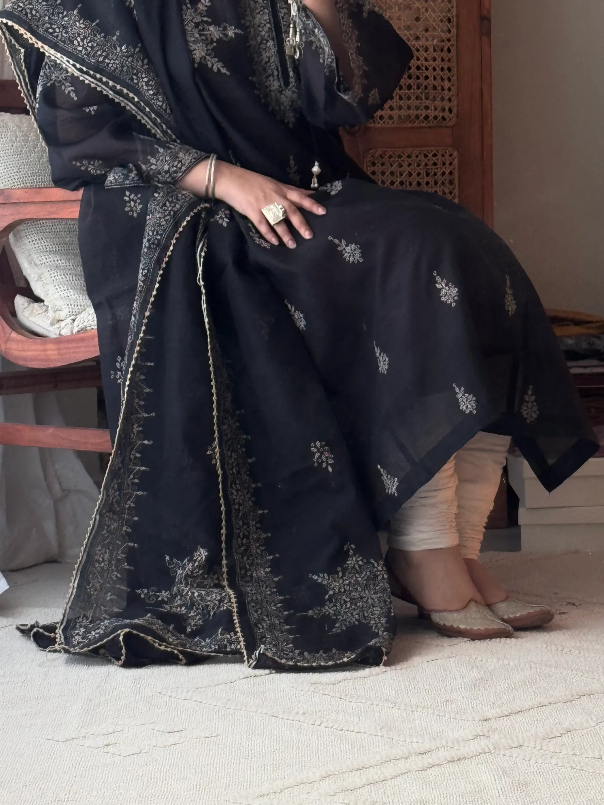 - Black 2 piece set featuring intricate Chikankari hand embroidery, designed with a side-slit neckline. Paired with a 3-yard dupatta finished with a beautifully detailed four-sided border. Slip included.