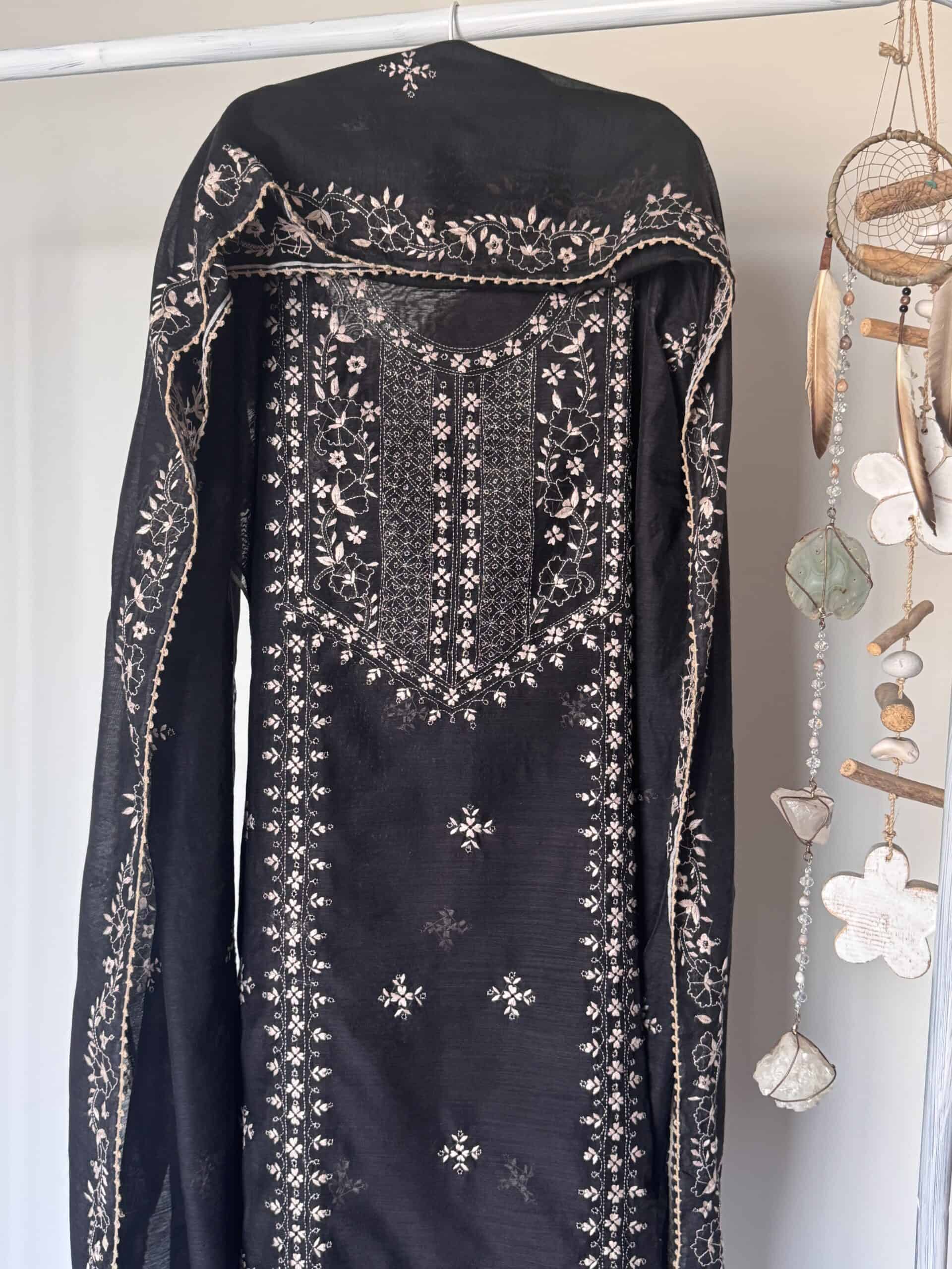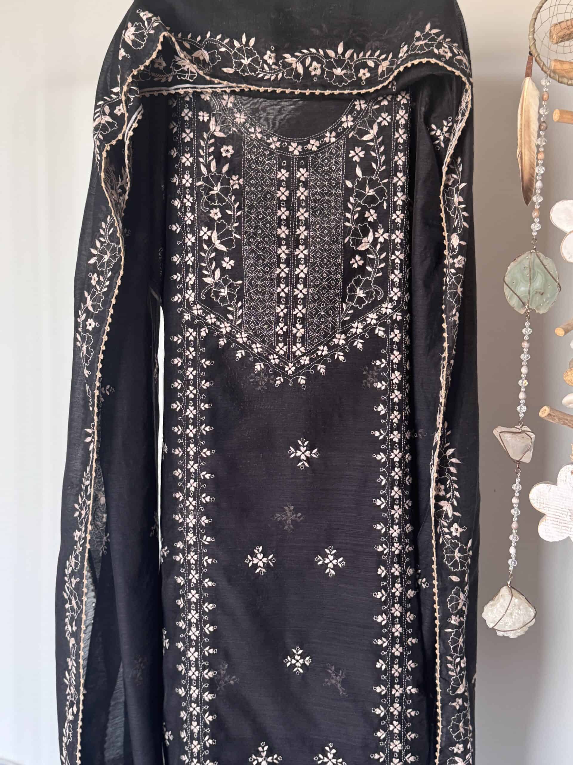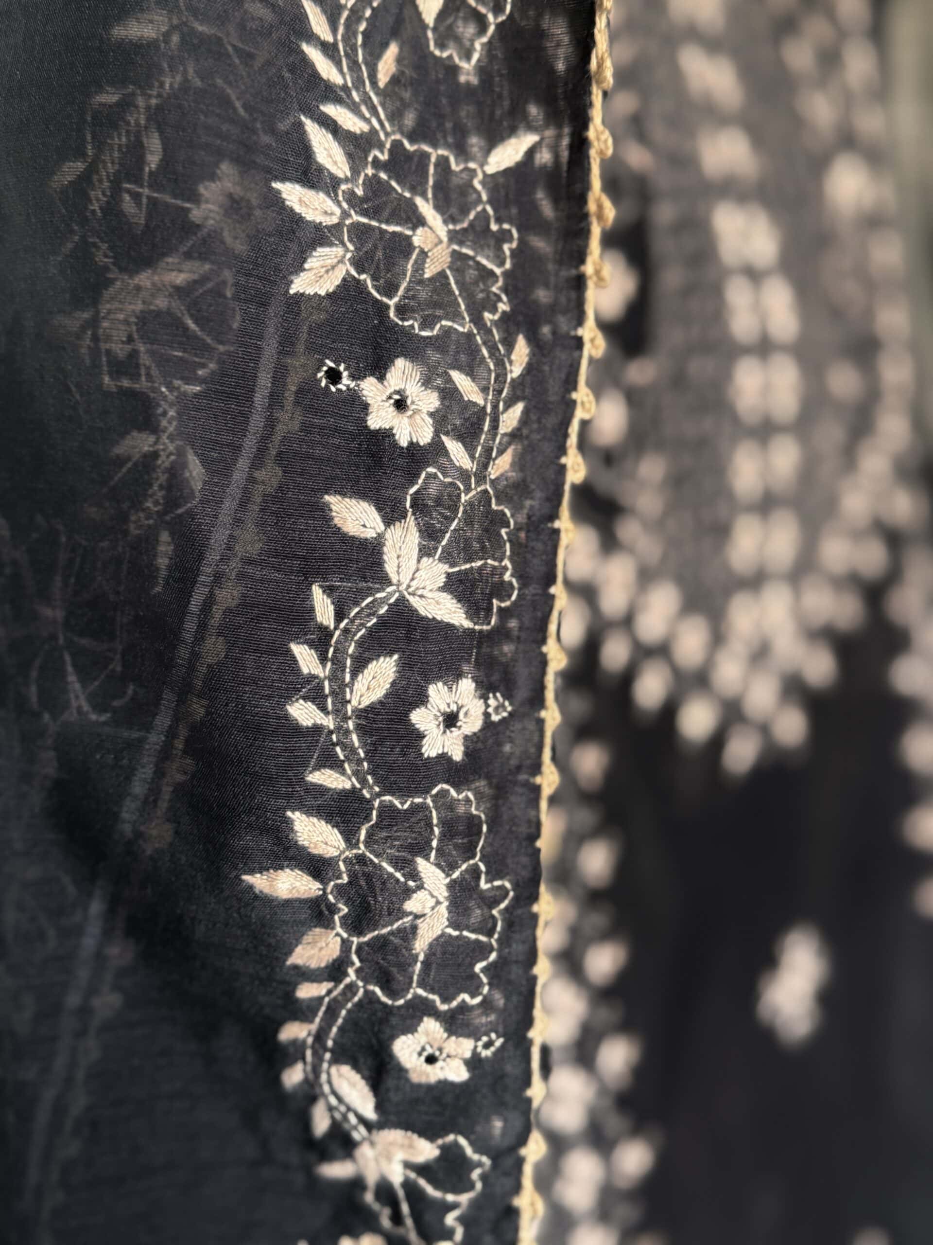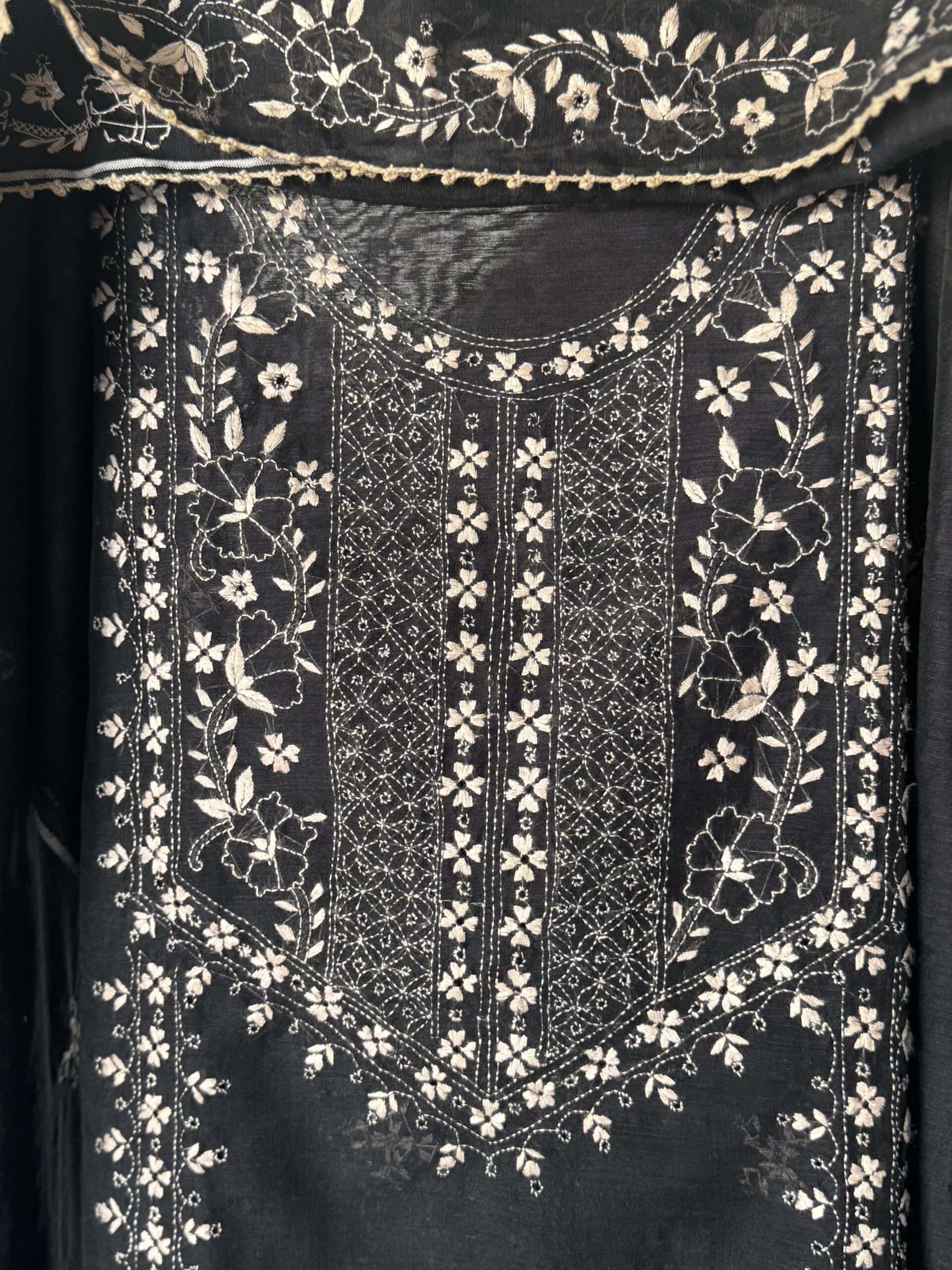 - Deep jet-black base adorned with intricate hand-embroidered Lucknowi chikankari in delicate ivory thread, showcasing fine floral vines, bootas, and shadow-work motifs