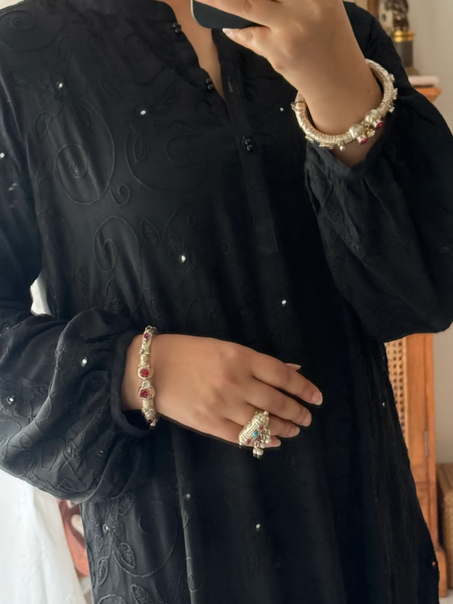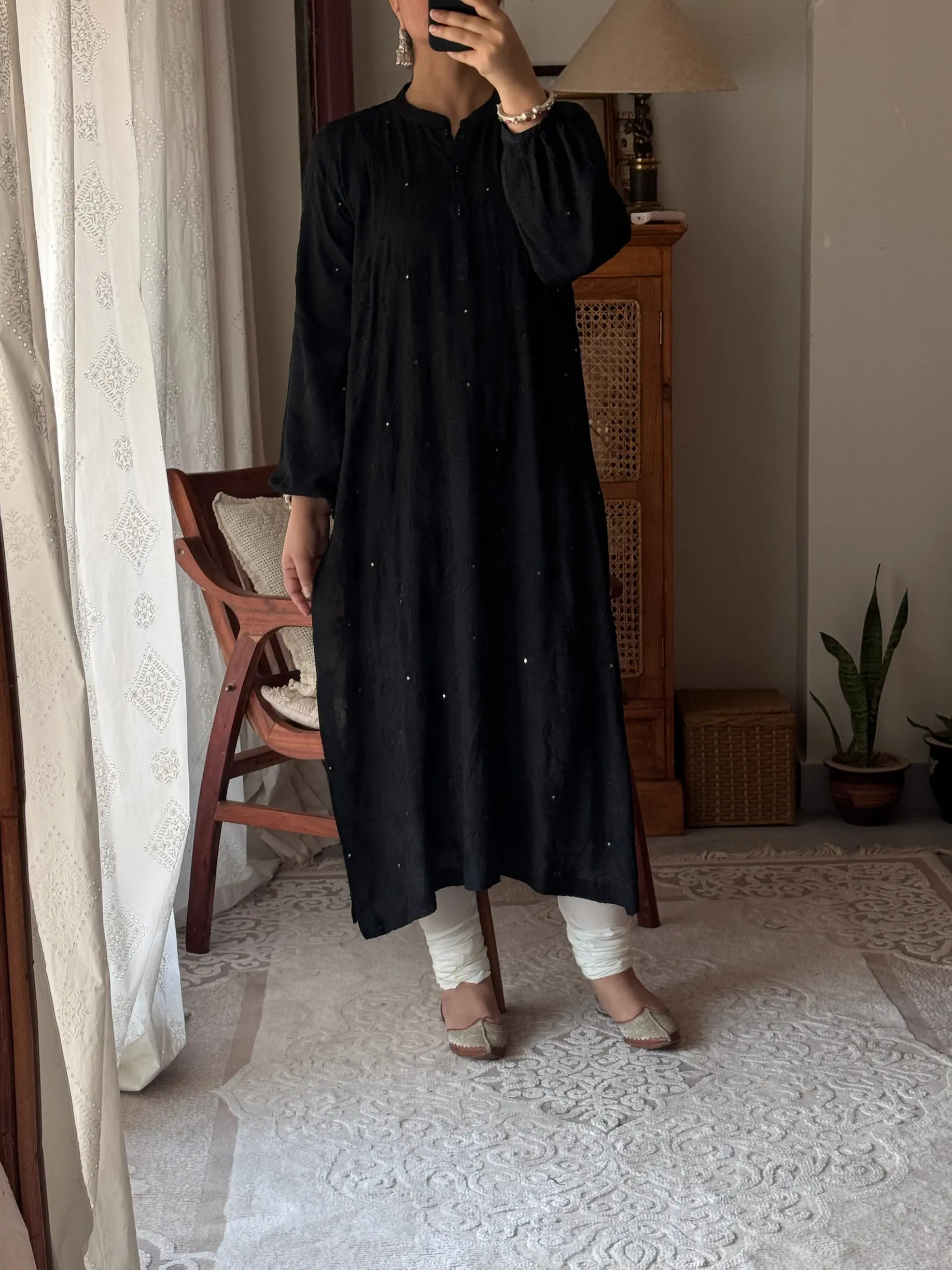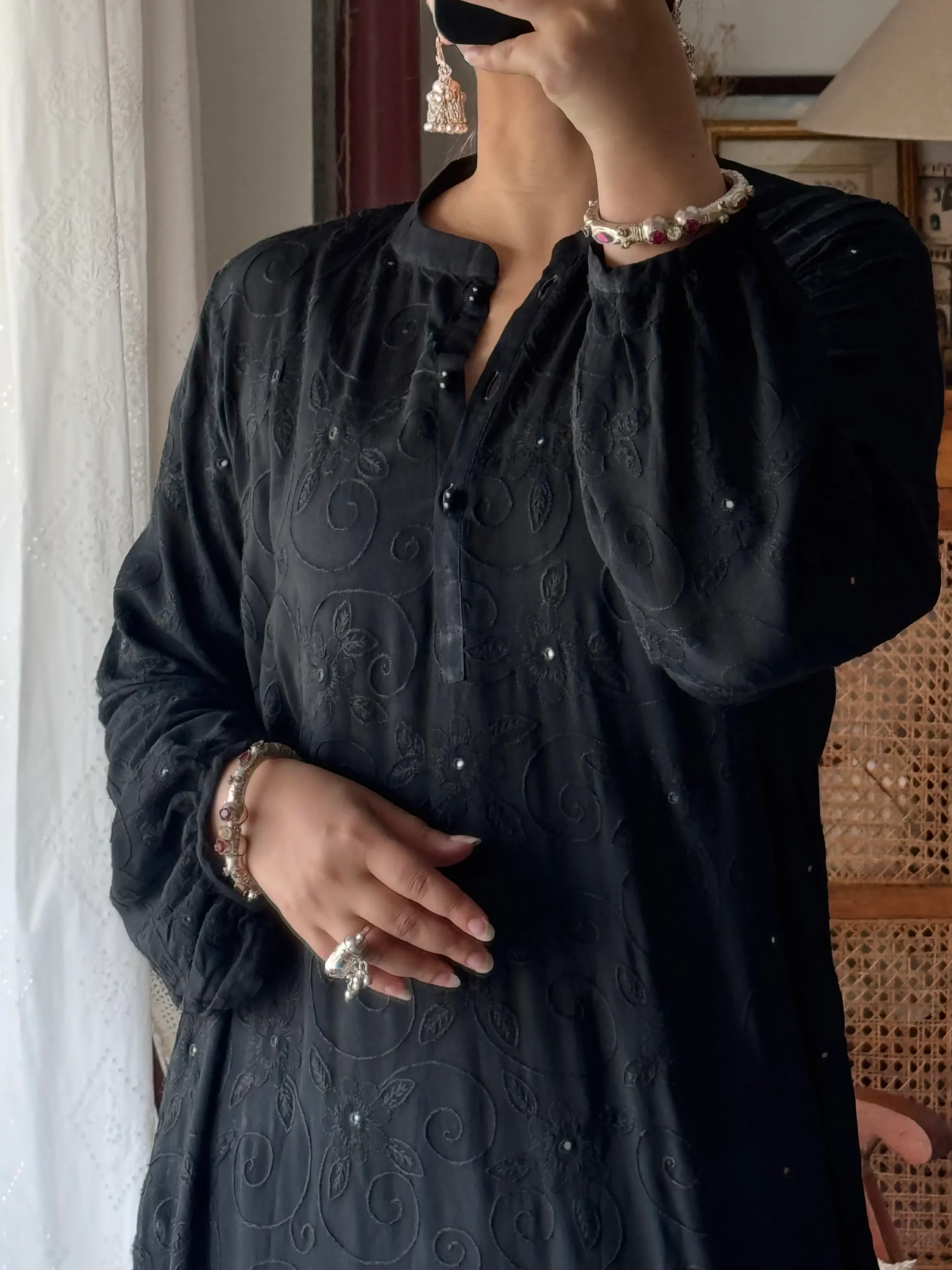 - A hand embroidered kurta featuring delicate shadow work and mirror detailing for a subtle, elegant shine.