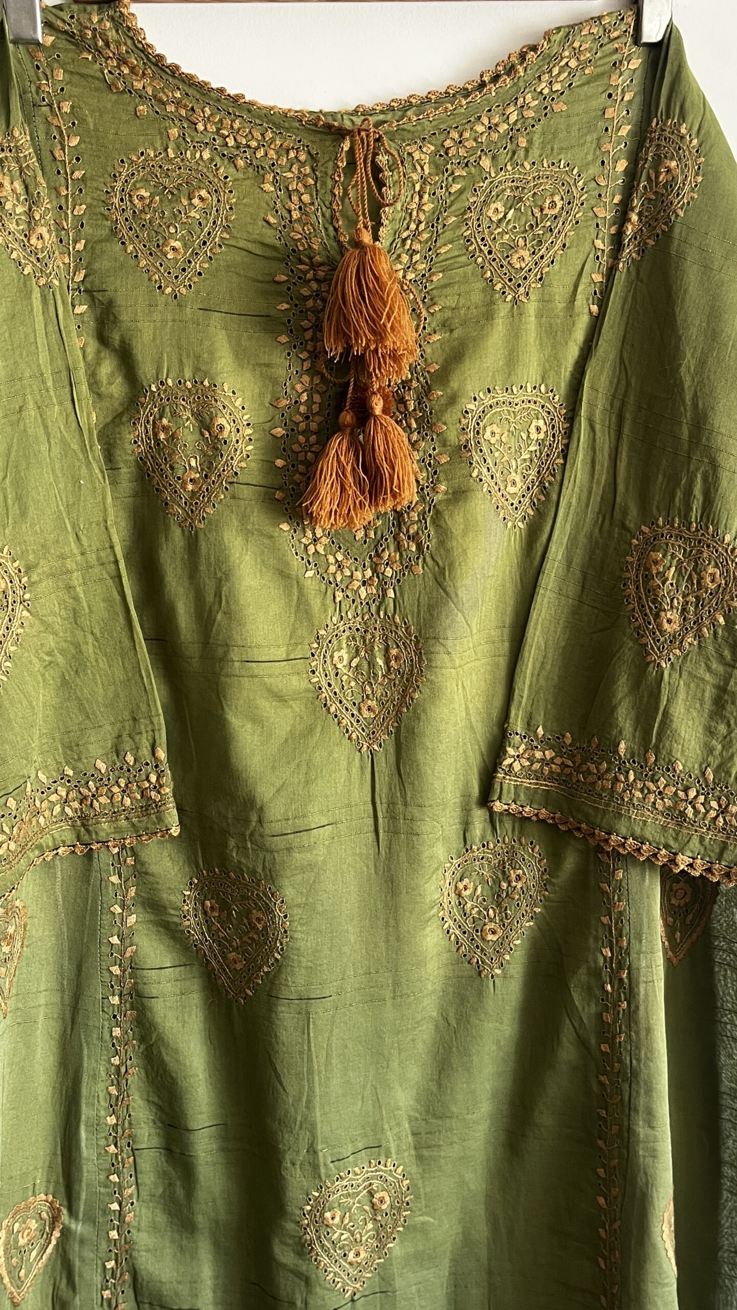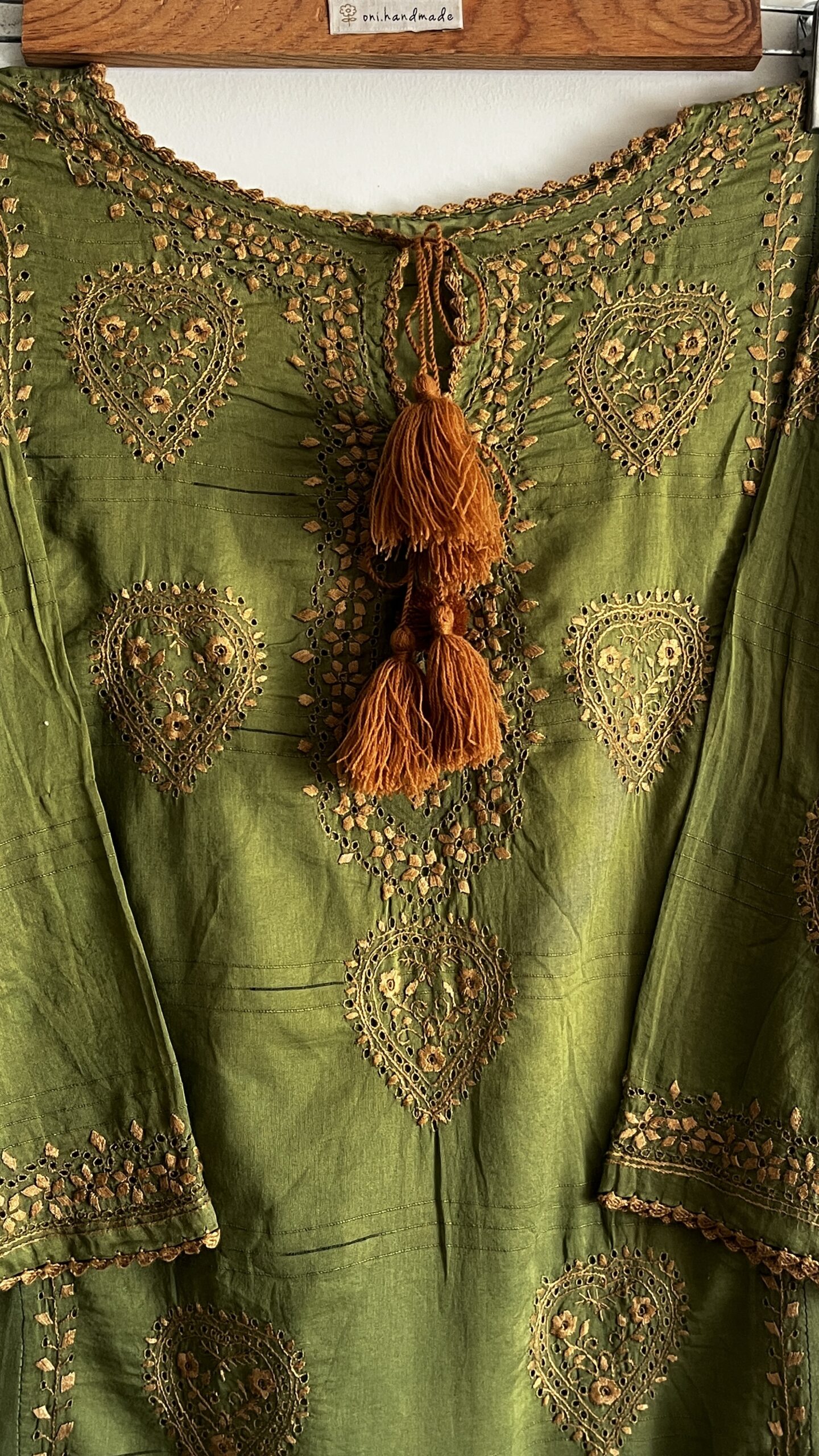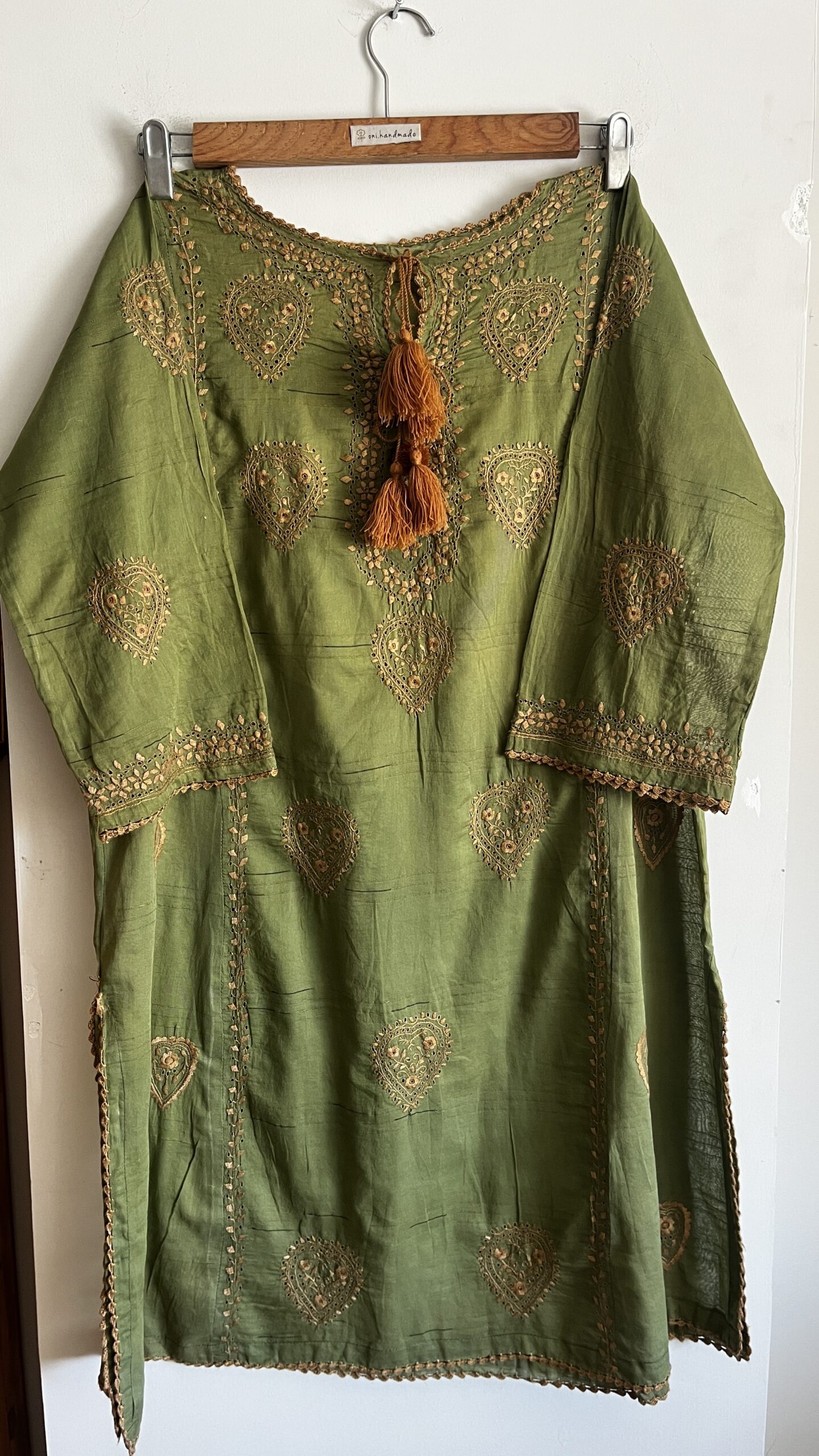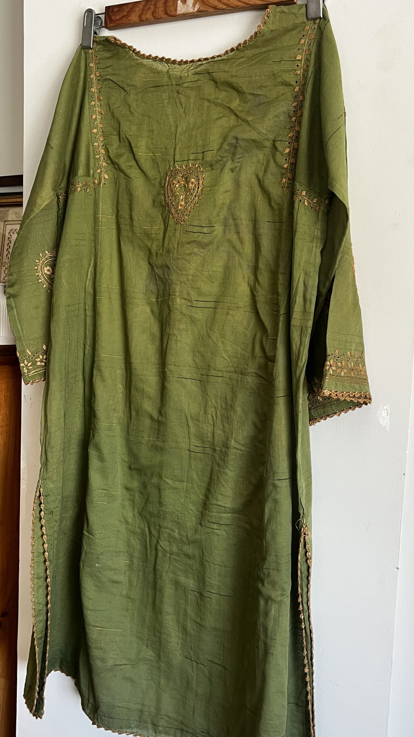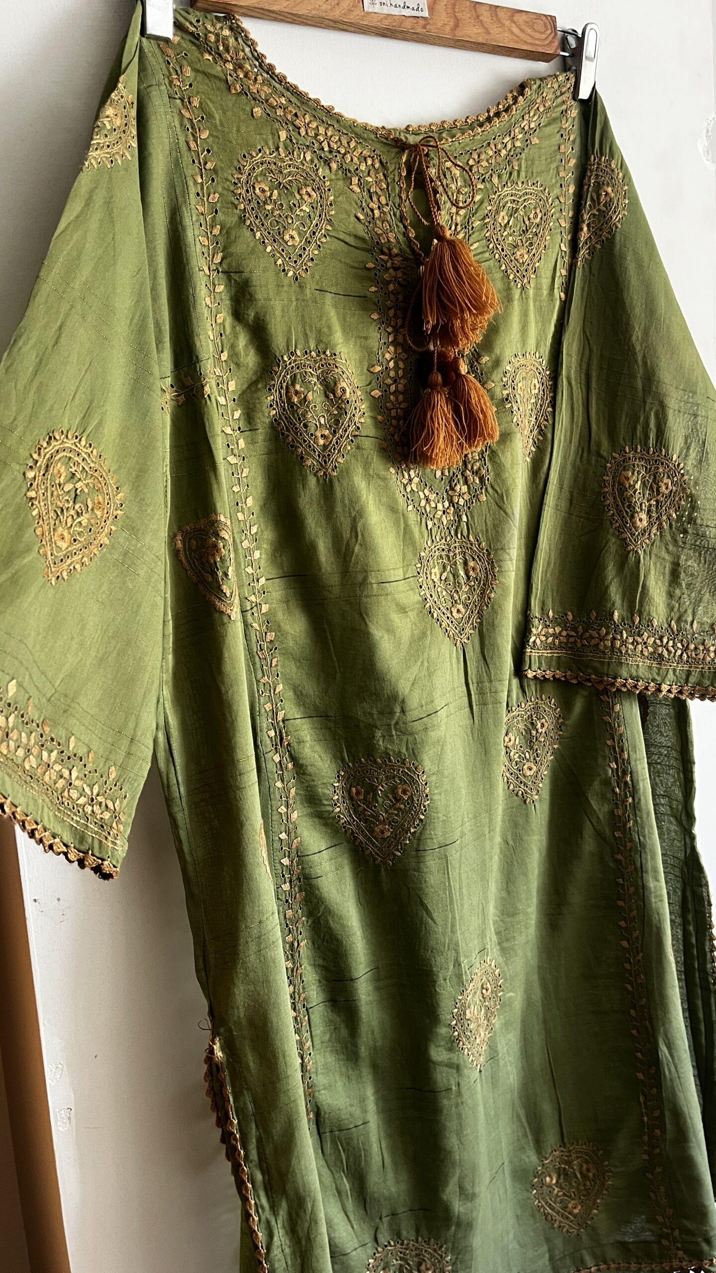 - Olive green kurta with intricate golden chikankaari embroidery and elegant paisley motifs.