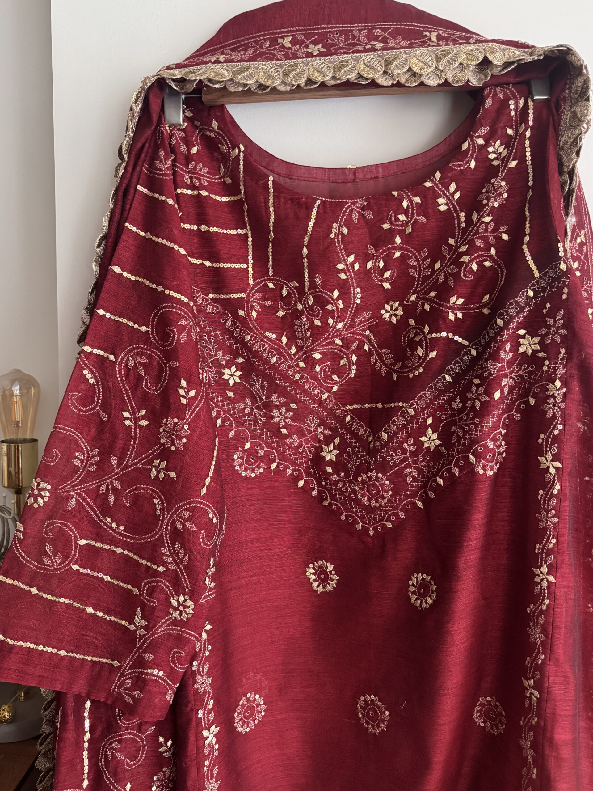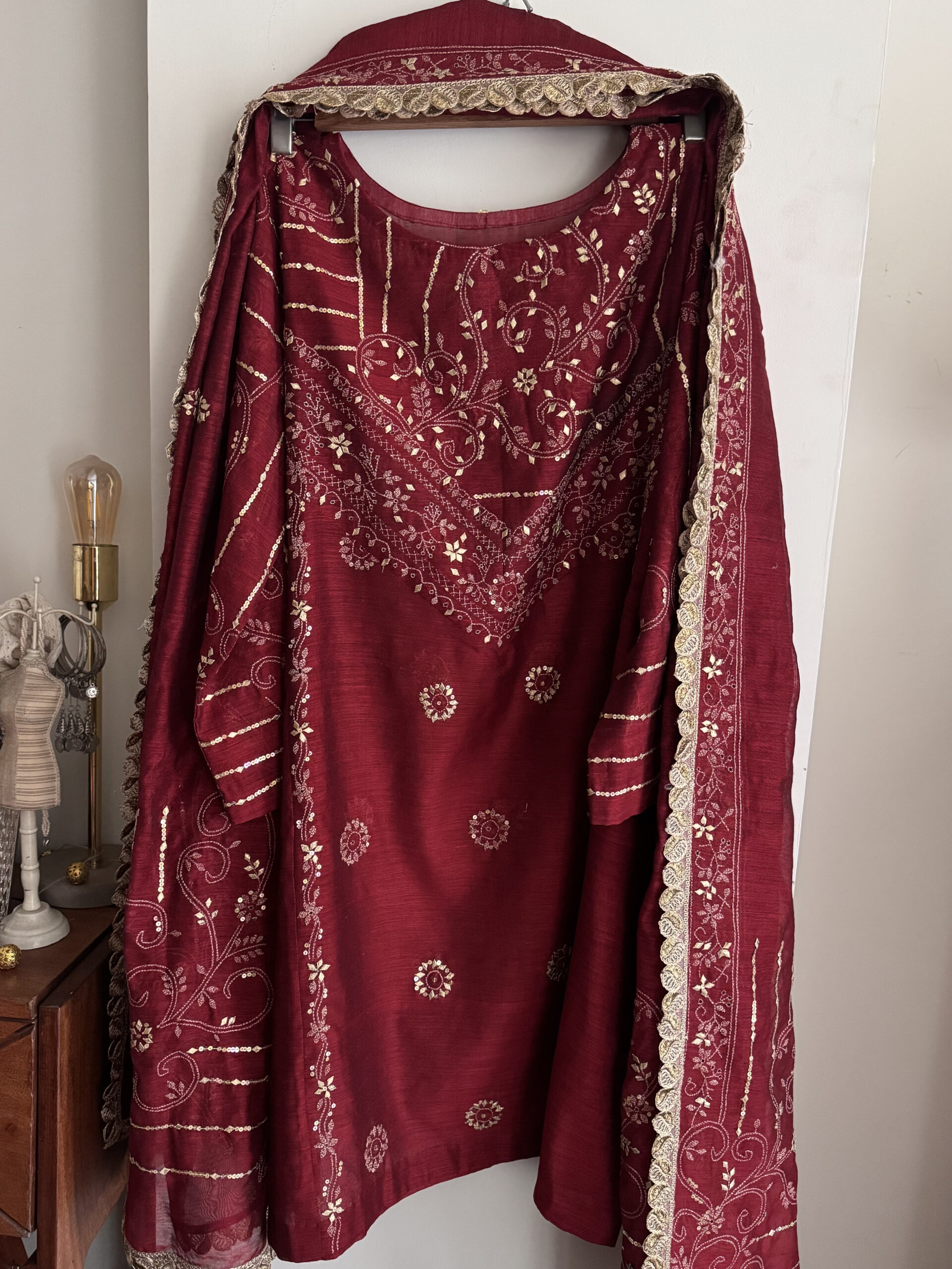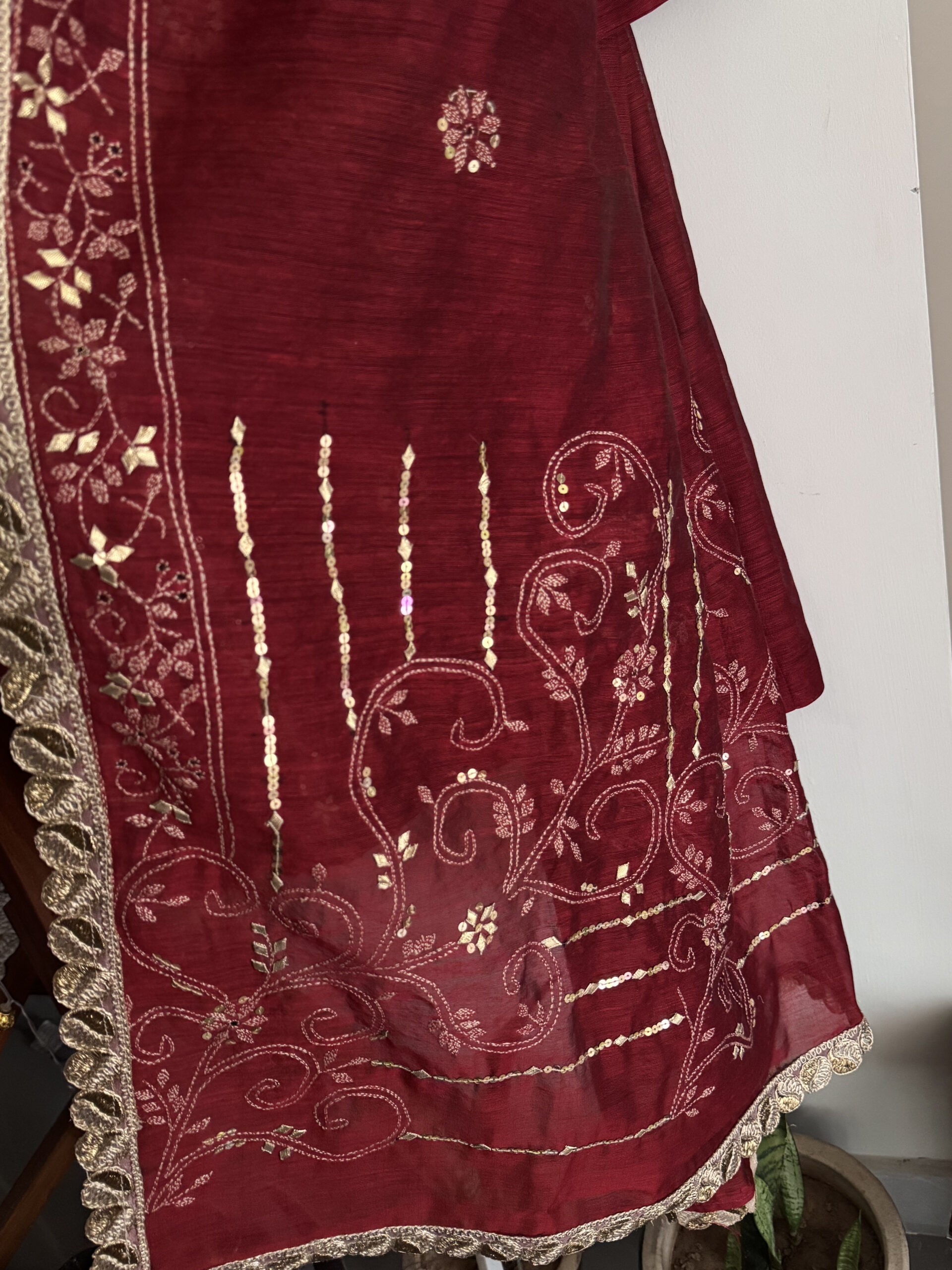 - Beautifully designed outfit featuring a mix of Gotta, Sitara, and Kacha Tanka embroidery.
