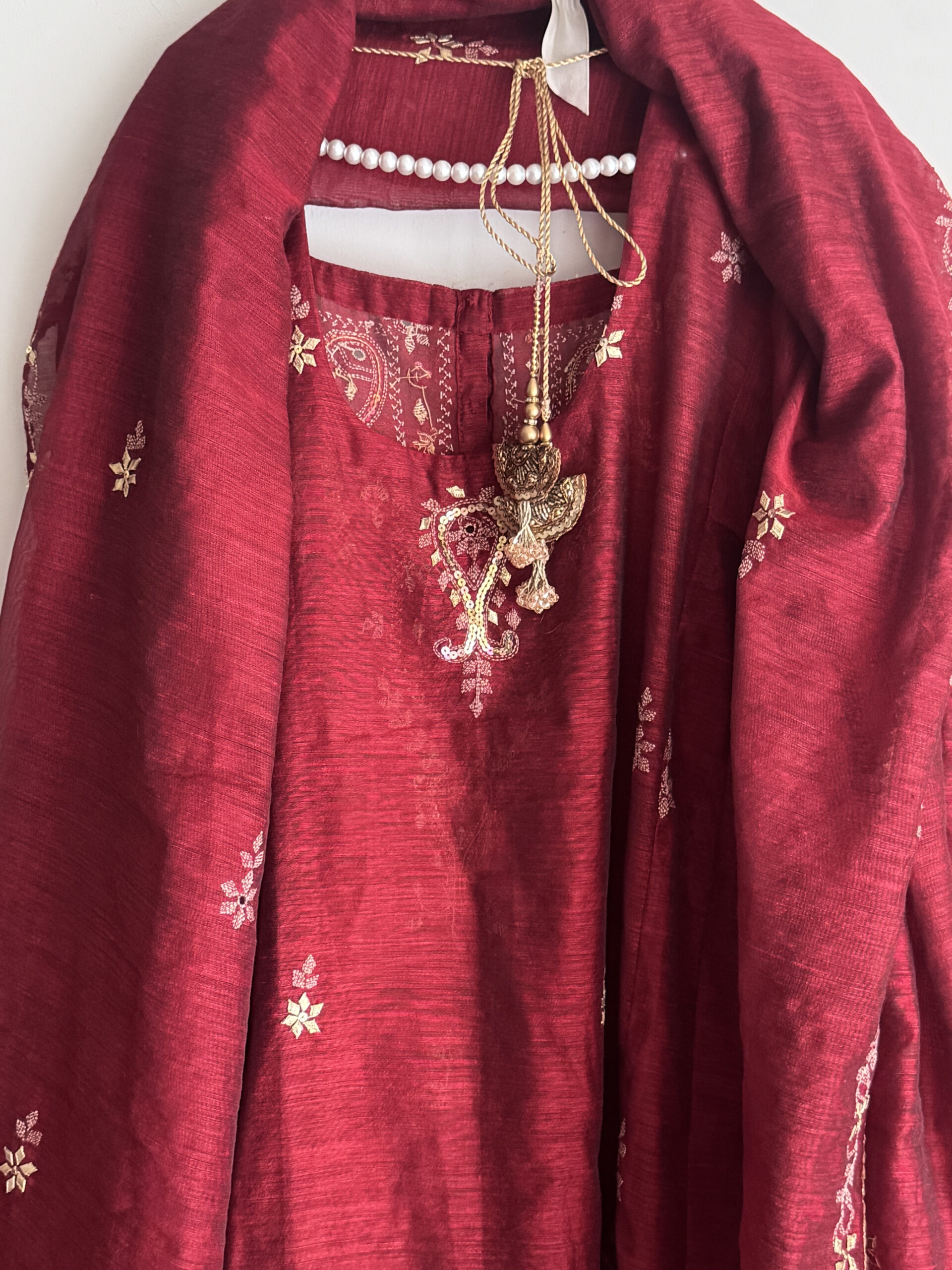 - Beautifully designed outfit, back with deep neck and tassels featuring a mix of Gotta, Sitara, and Kacha Tanka embroidery.