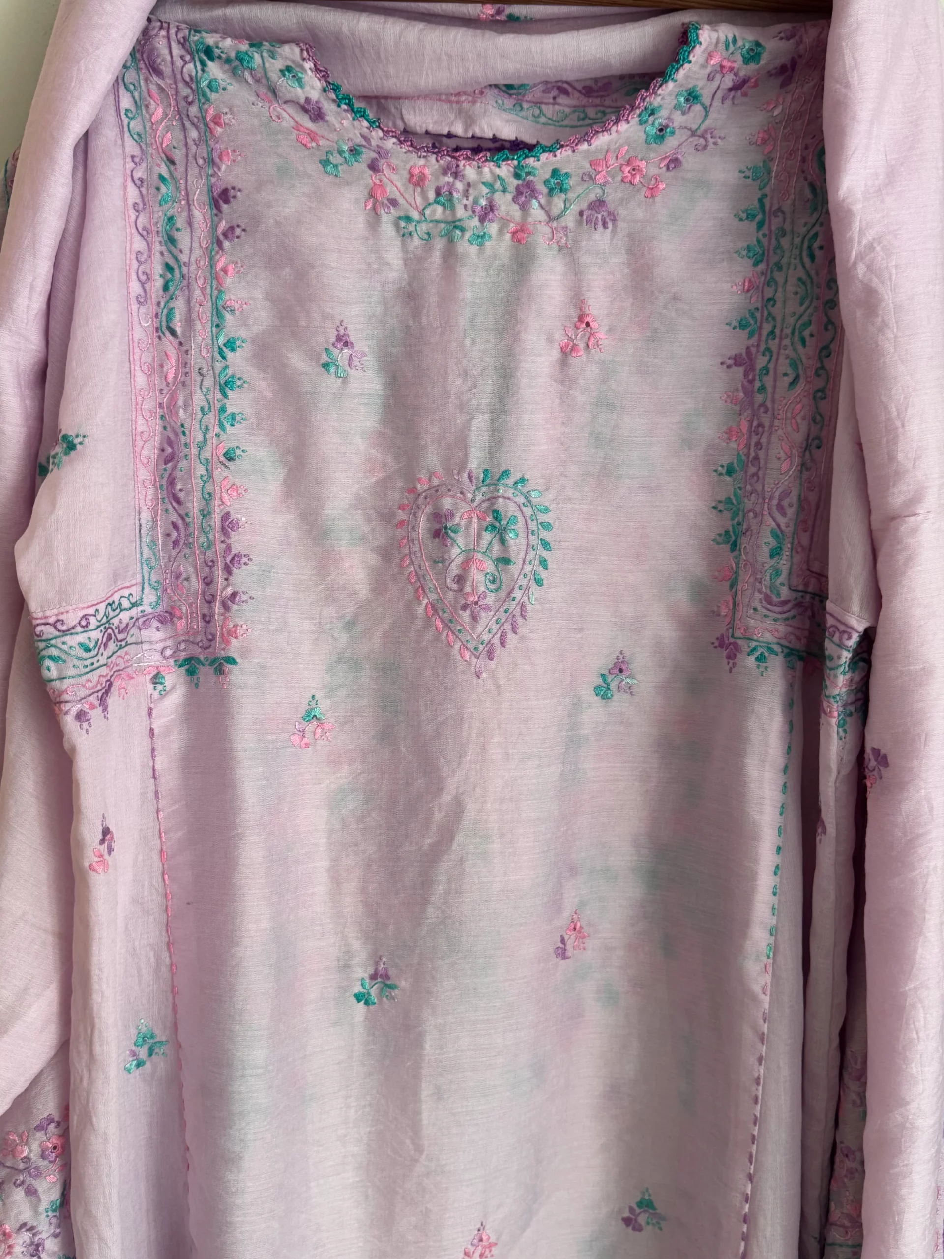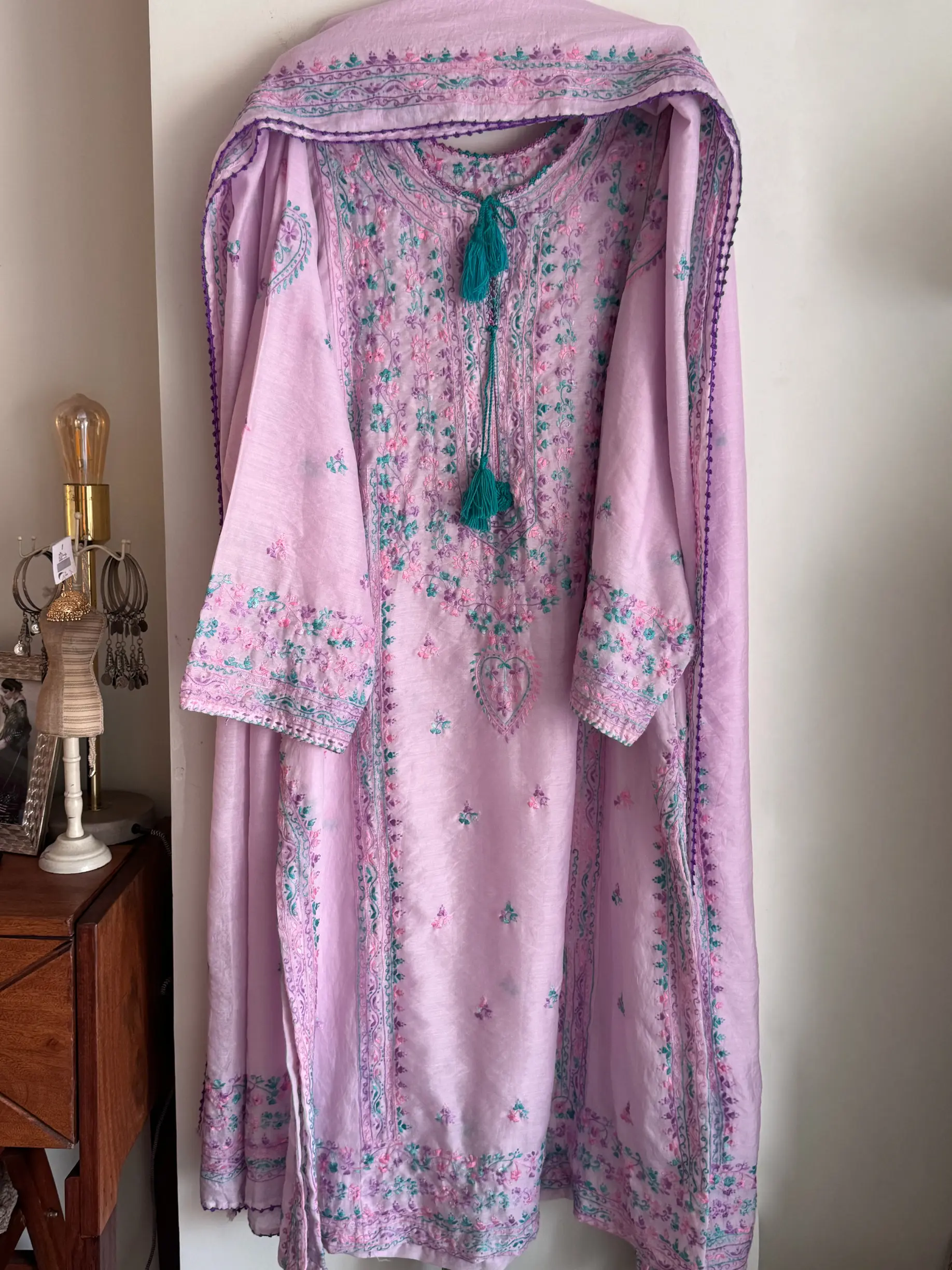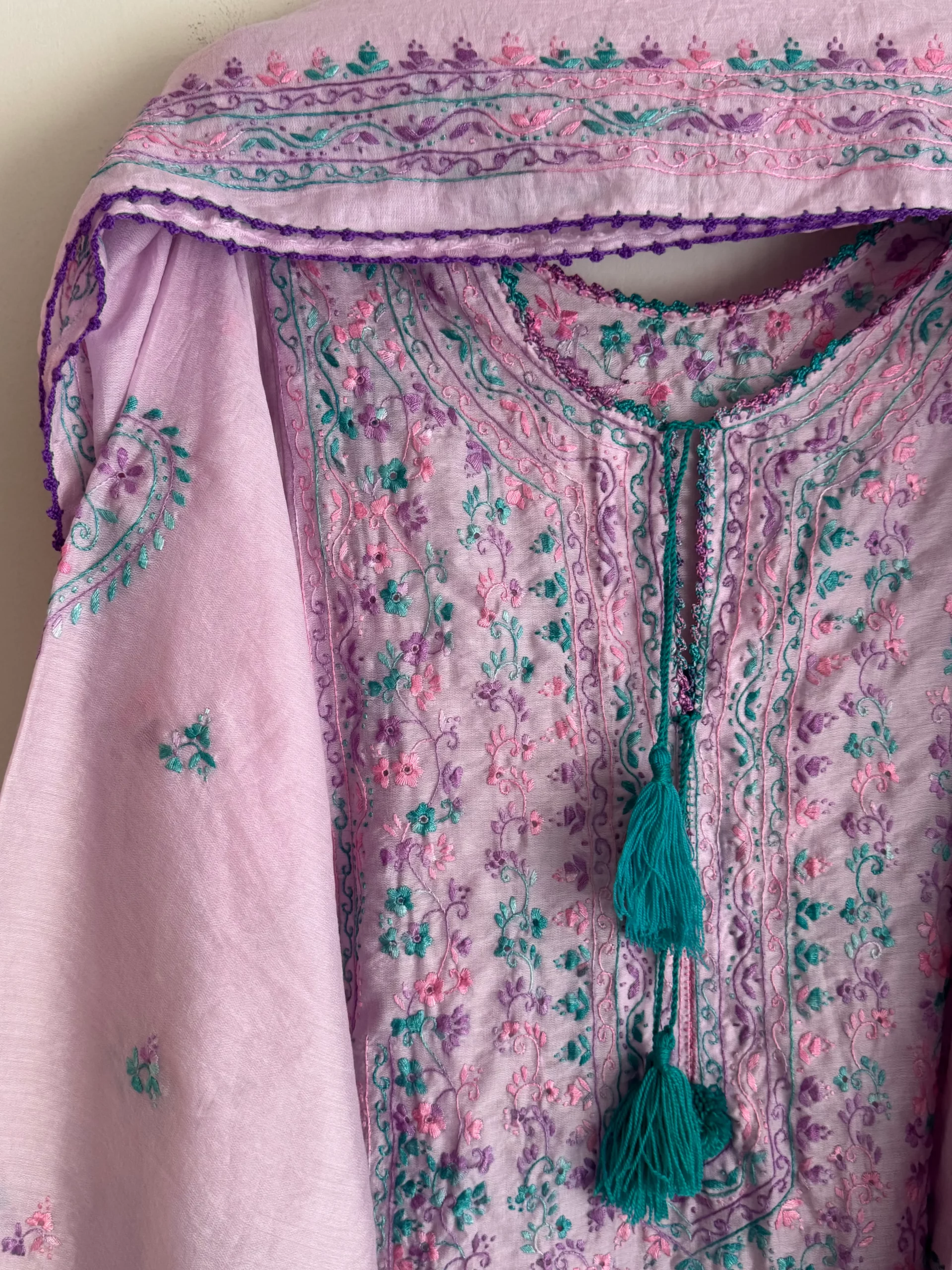 - A heavily hand-embroidered kurta paired with a dupatta featuring a four-sided border finished with hand-woven crochet detailing.