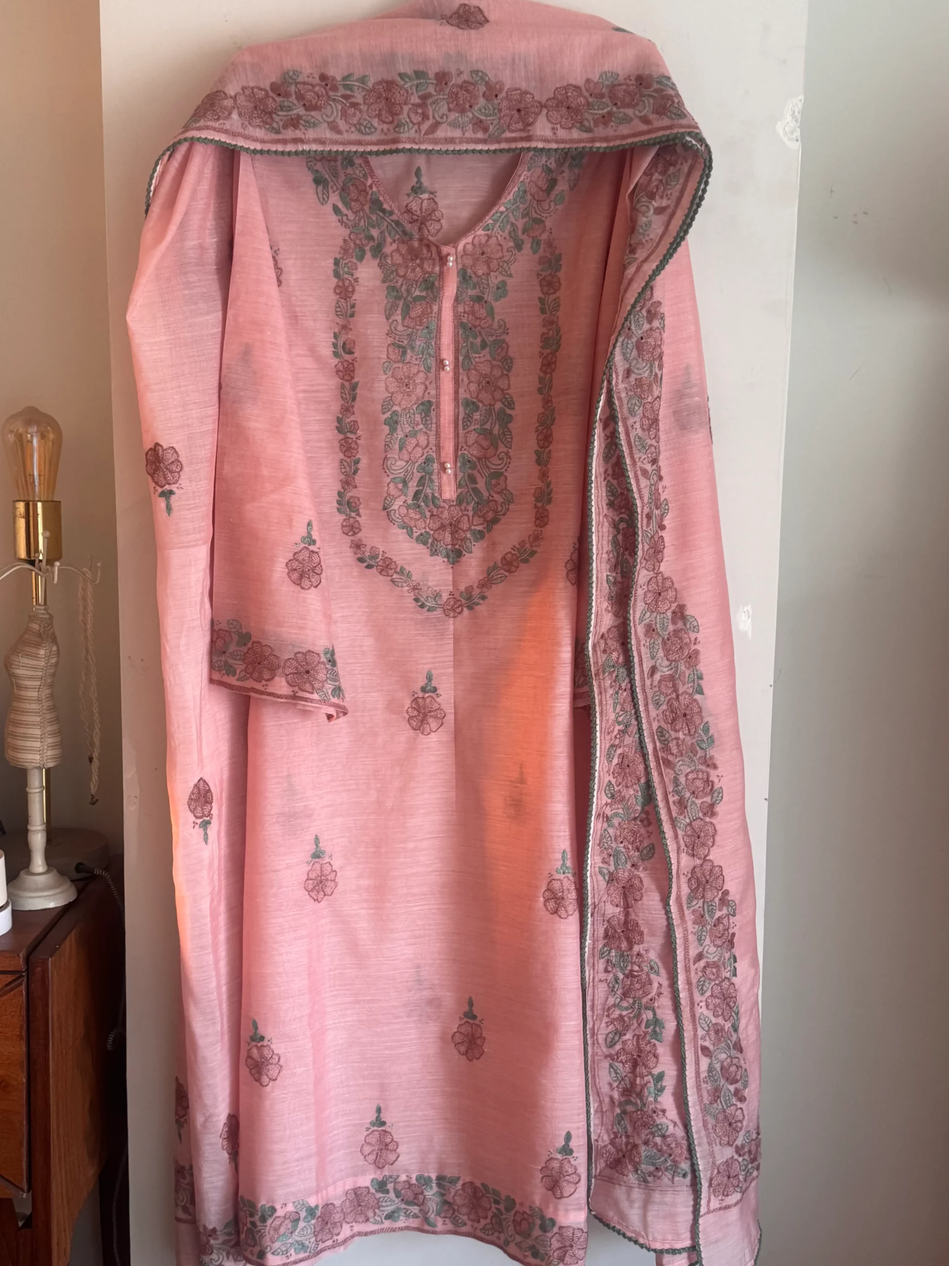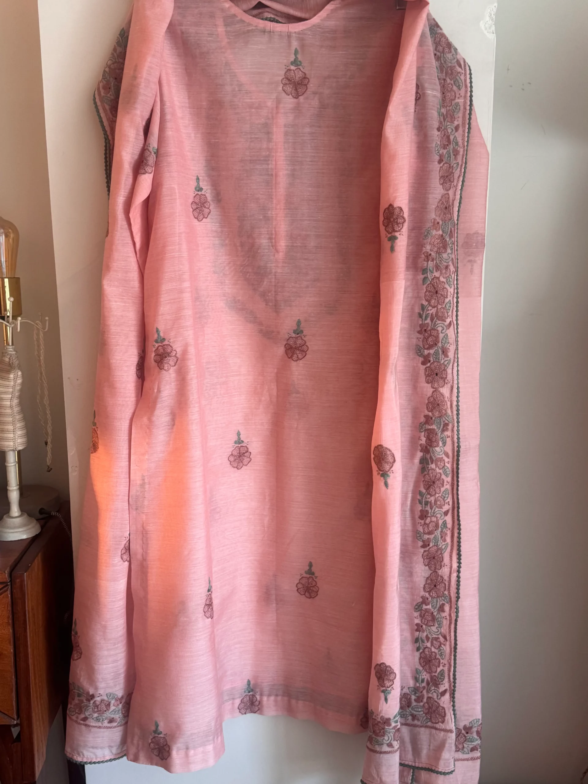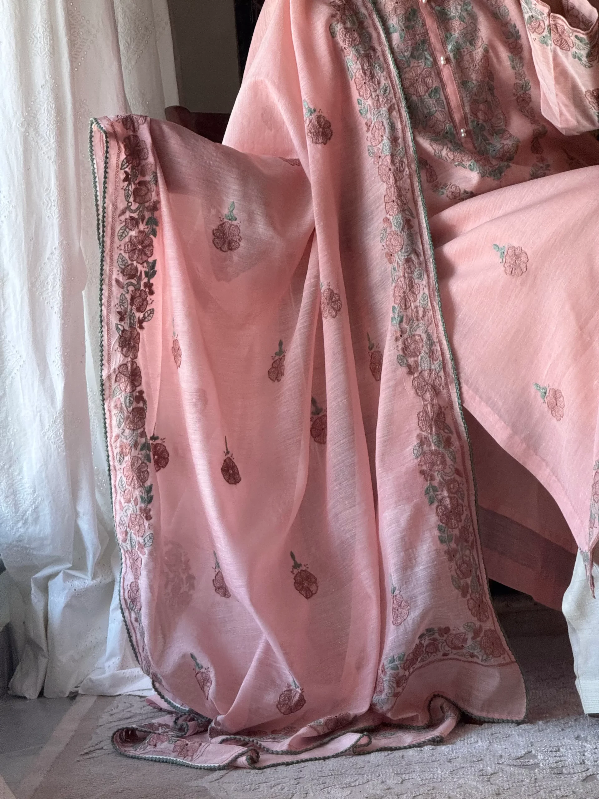 - A soft blush peach pink two-piece, fully hand-embroidered with delicate shadow work on the kurta. Paired with a 3 yard dupatta, finished with a four sided border and intricate crochet detailing. Slip included.