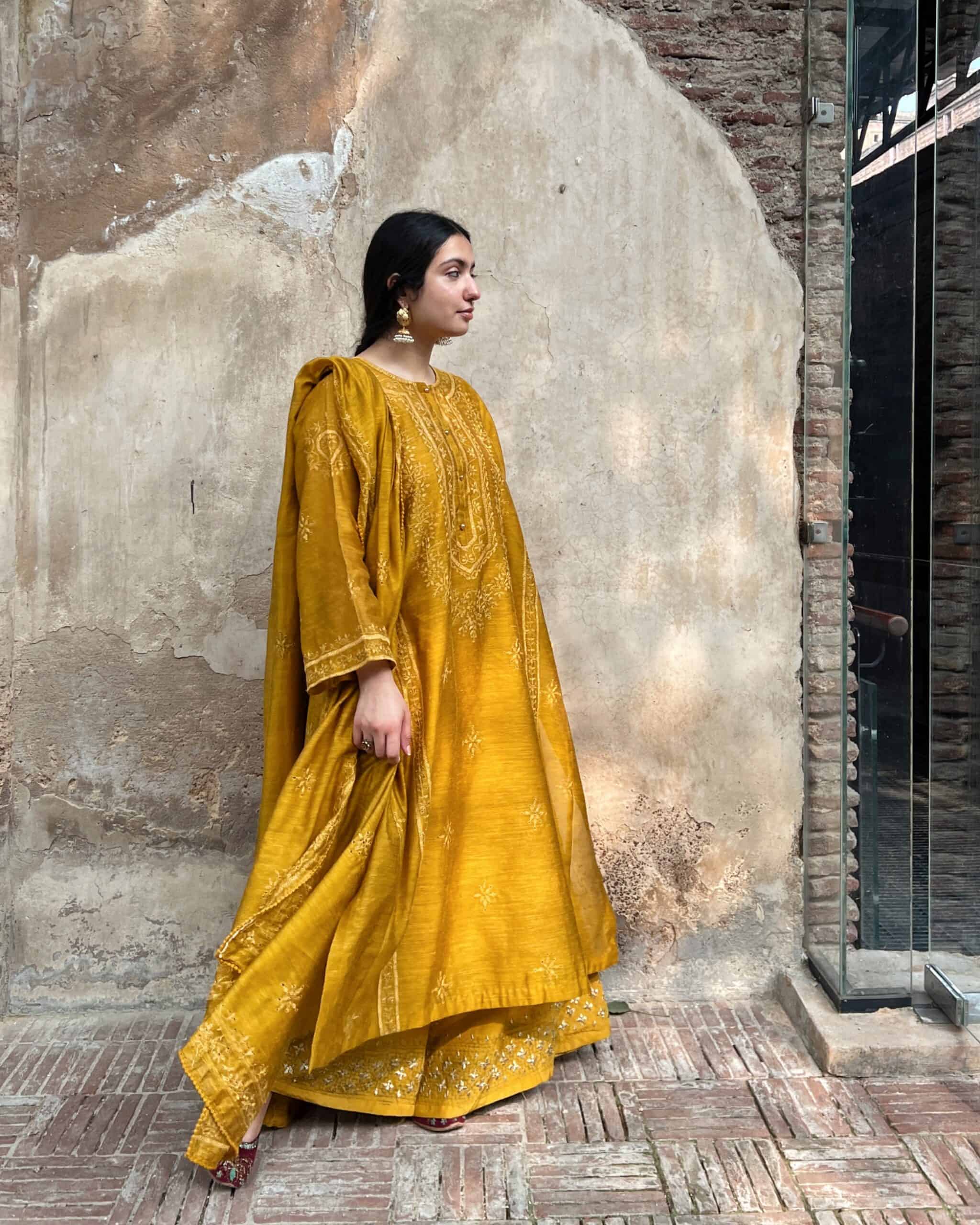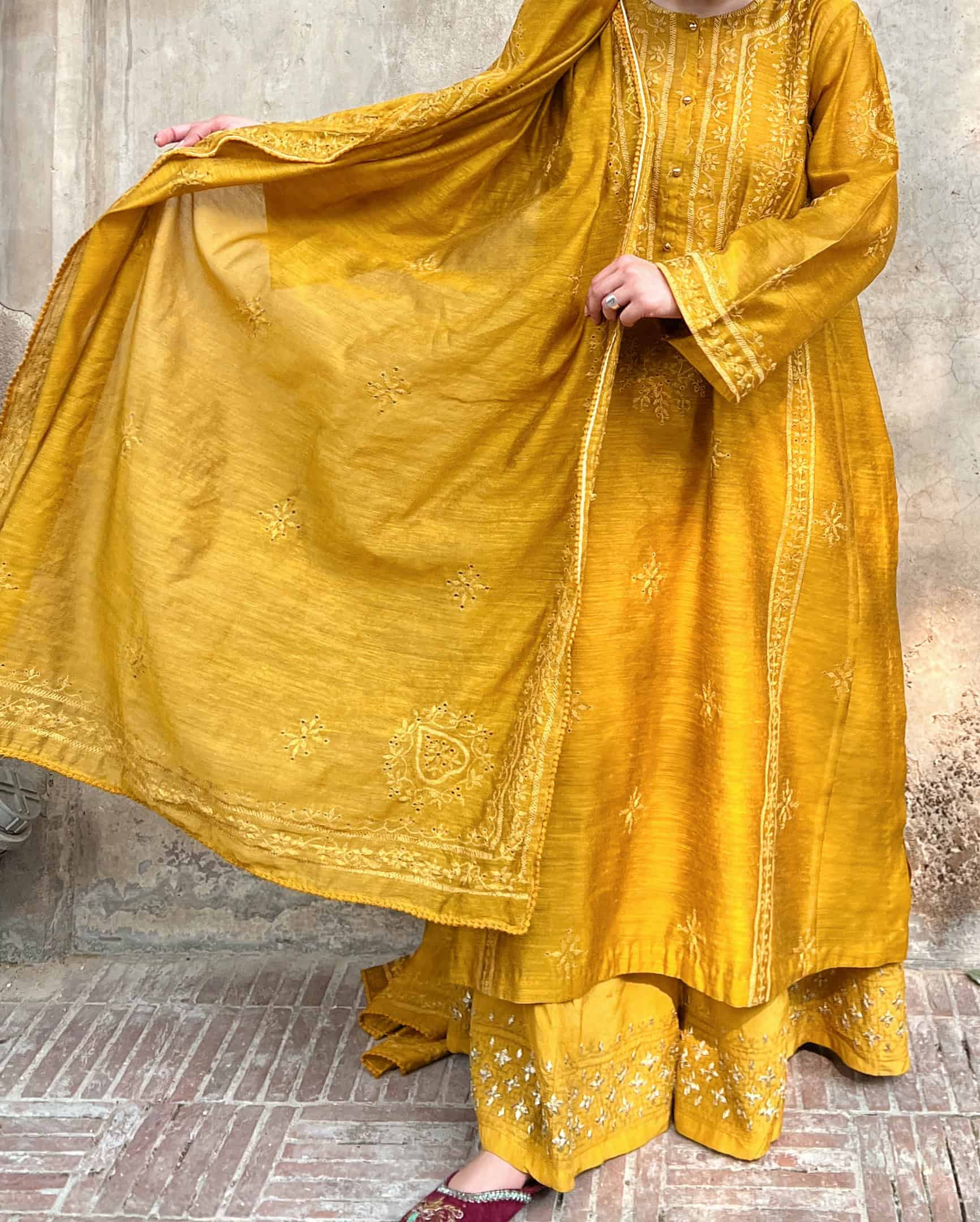 Pure Tussar Cotton Karandi Golden-Marigold 2-Pc Stitched Anarkali Set – Regal Chikankari & Mukaish